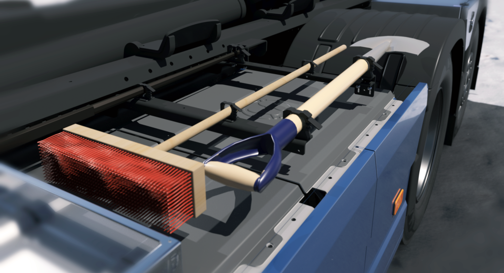 Ett universellt redskapsfäste som enkelt monteras över verktygslådor, dieseltankar eller batterikåpor och som gör att spade, spett och borste alltid kan följa med på ett lättåtkomligt och smidigt sätt.