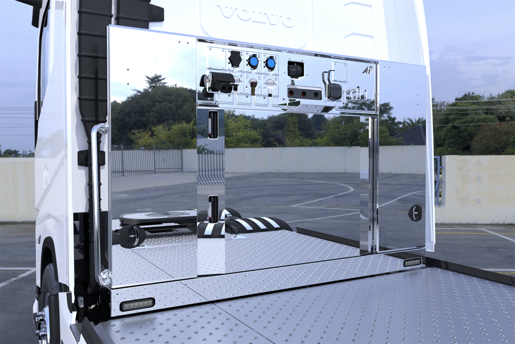 Stilrent bakomhyttskåp med hydraulik för tipptrailer och rikligt med förvaring. Tillverkad i blankt, rostfritt stål för ett stilrent utseende som står ut från mängden.