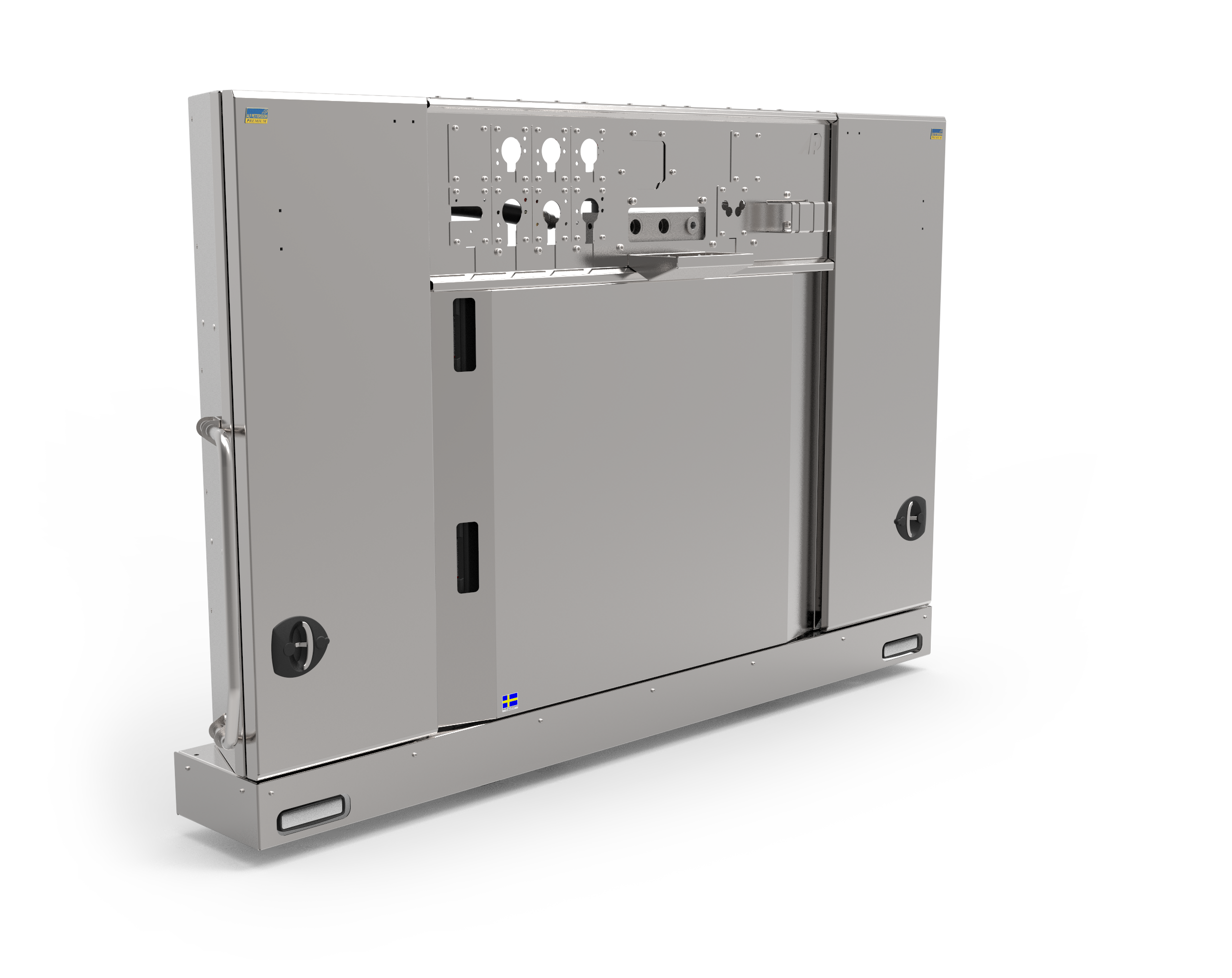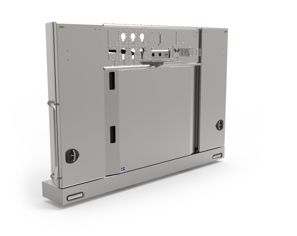 Stilrent bakomhyttskåp med hydraulik för tipptrailer och rikligt med förvaring. Tillverkad i blankt, rostfritt stål för ett stilrent utseende som står ut från mängden.