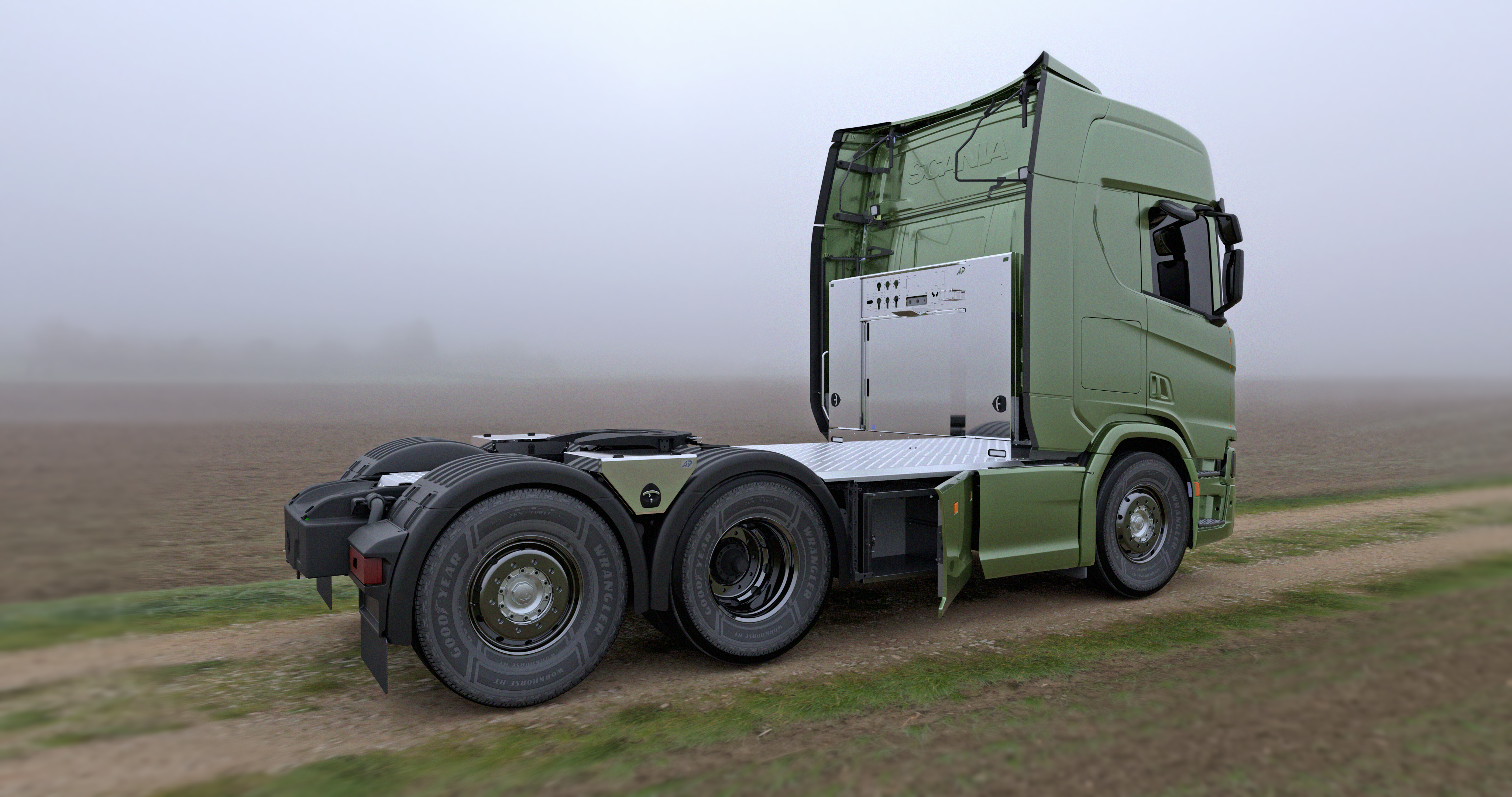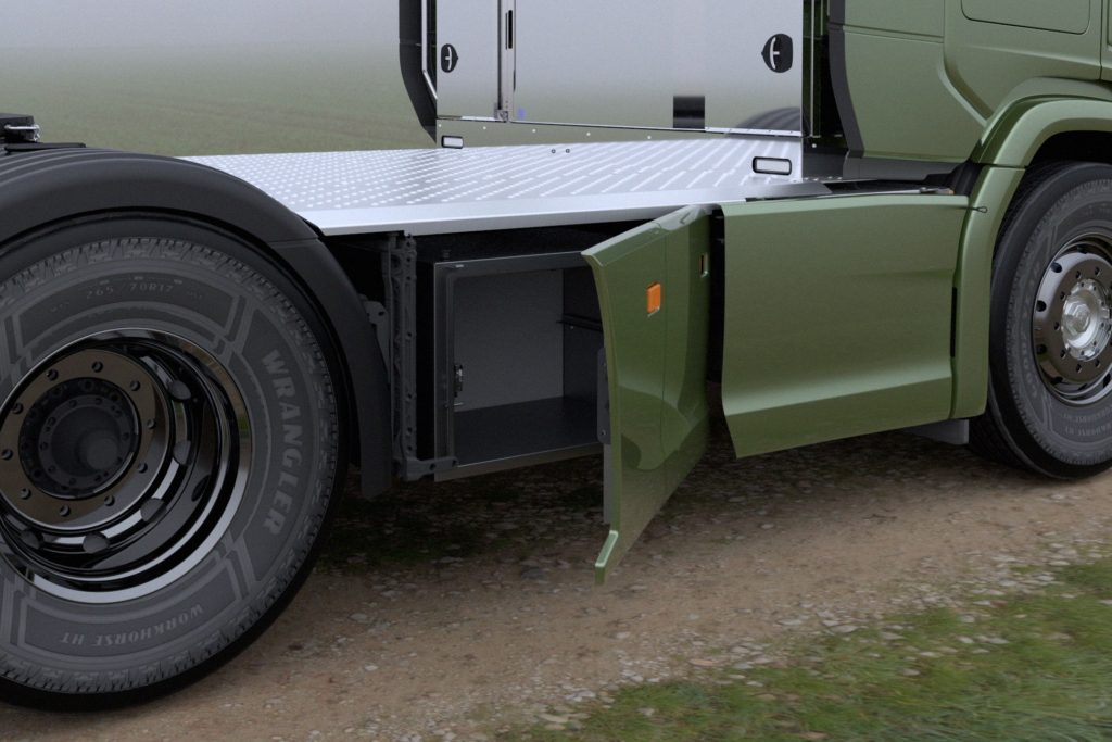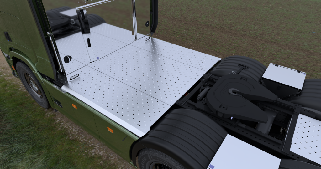 På Green Cricket, den härligt gröna dragbilen från Scania har vi monterat komplett förvaringssystem. Med både bakomhyttskåp som inkluderar hydraultanken, integreringslåda och boggilådor har vi utnyttjat alla tomma utrymmen. Gångbordet använder du för att komma upp till kopplingarna och det ger dessutom en snygg helhet till din dragbil. Använd måsvinge-öppningen för att tanka.