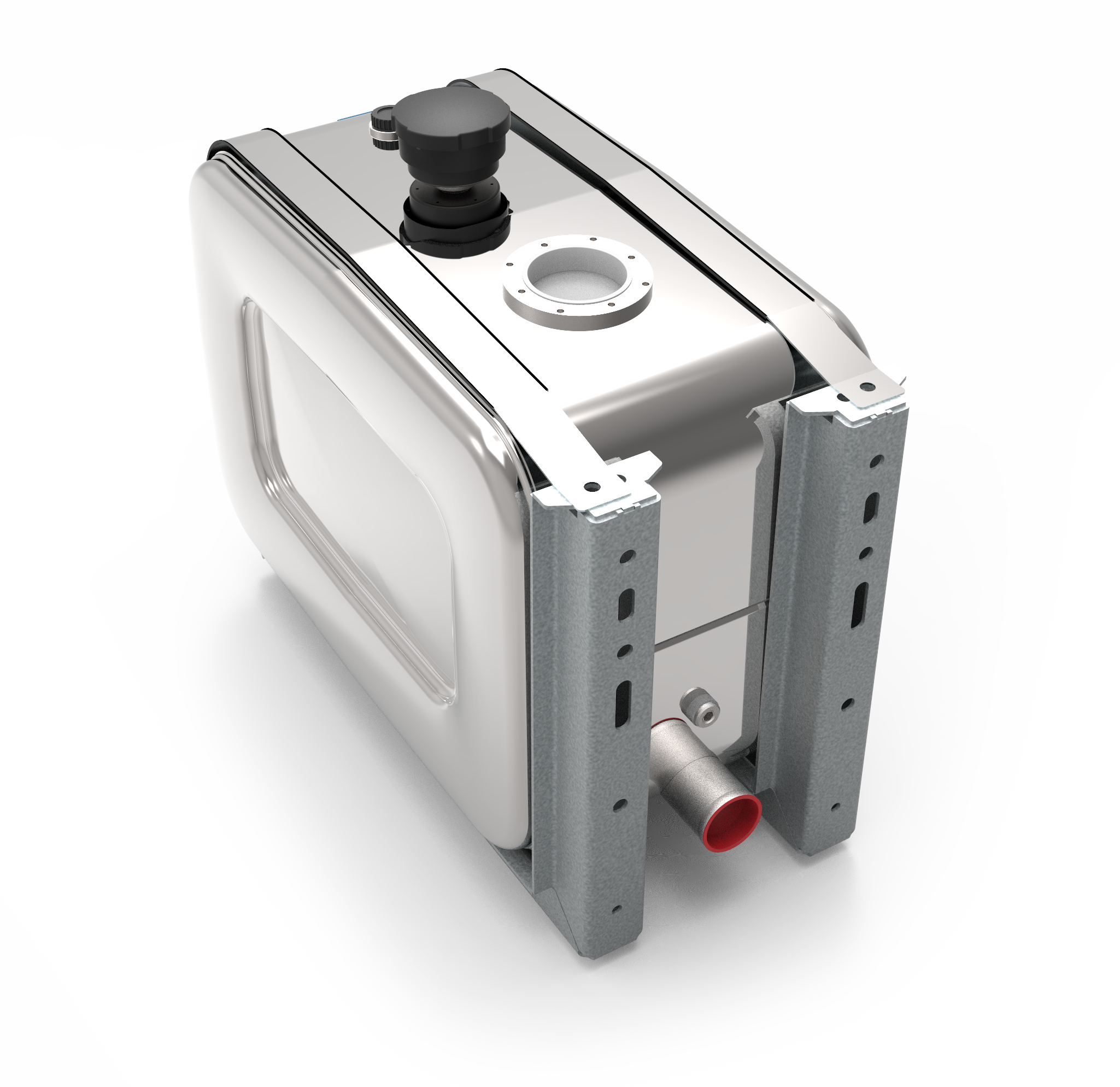 Stainless steel polished tank with gross volume 128 L, with complete mounting kit and air filter. Small flange on connection for hydraulic oil filter.