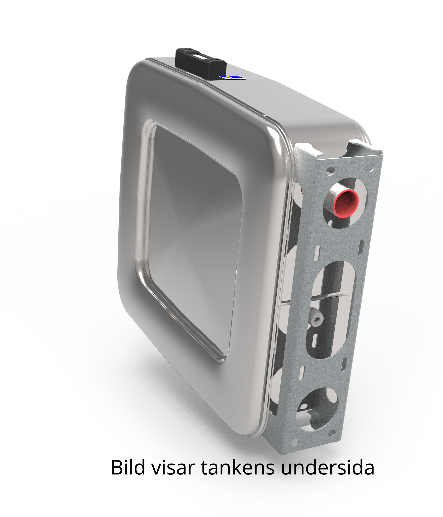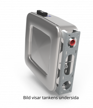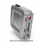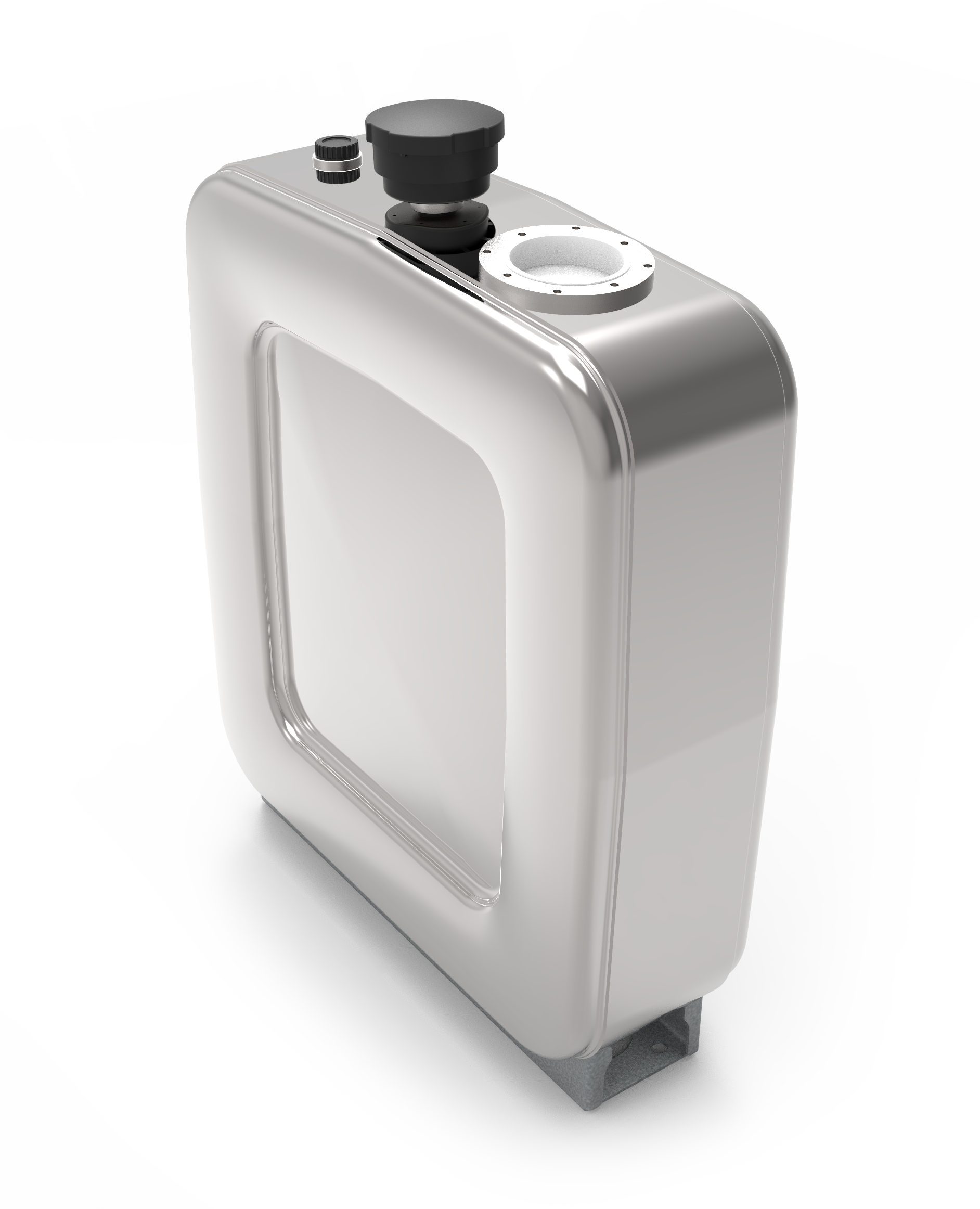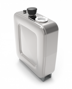 Stainless steel polished steel tank with gross volume 90 L, with mounting foot and air filter. Small flange on connection for hydraulic oil filter.