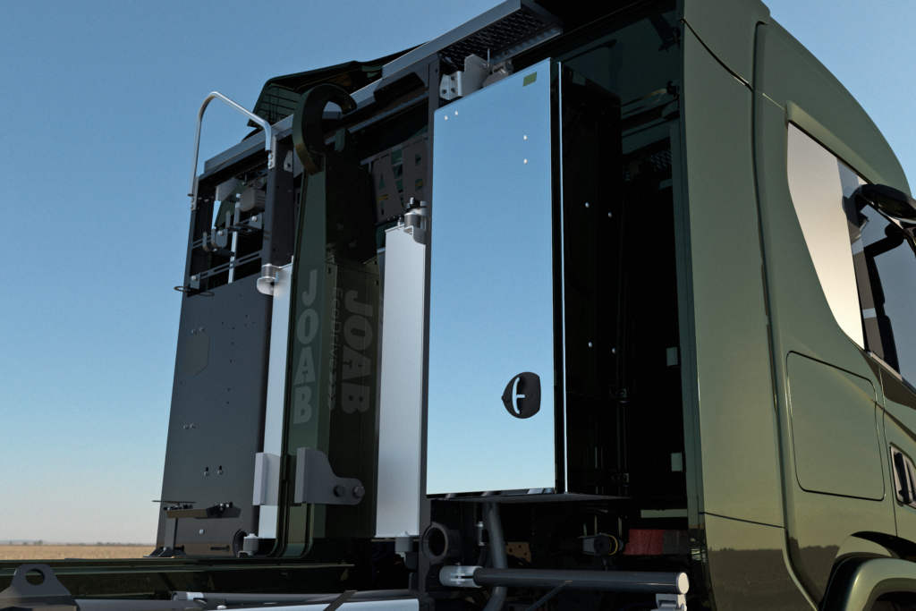 Detta skåp monteras bakom hytt tillsammans med till exempel vår hydraultank Rough. (på denna bilen är den monterad tillsammans med redskapsfäste och krok) Skåpet i sitt original utförande har två hyllor och spanjolettlåsning, för att du enkelt skall kunna öppna från marken.