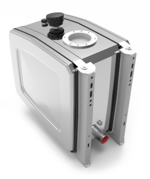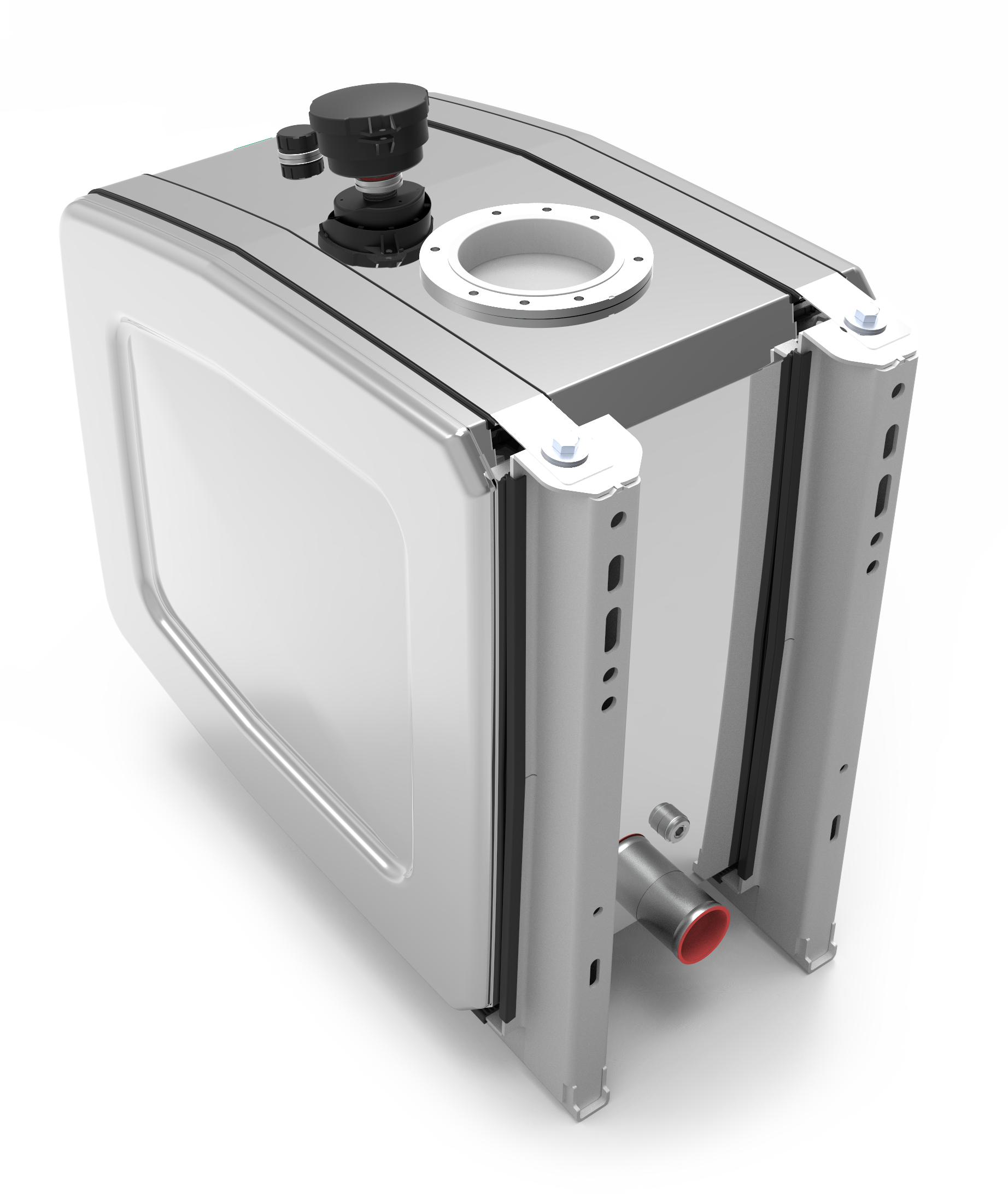 Rostfri blankpolerad tank med bruttovolym 185 L, med komplett monteringssats och luftfilter. Stor fläns på anslutning för hydrauloljefilter.
