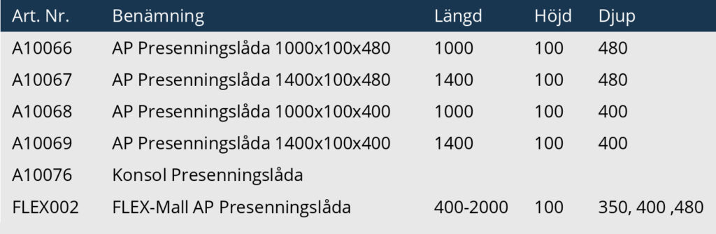 Utöver standarddimensioner erbjuder vi även en flexibel lösning (FLEX) där du kan anpassa längd och djup efter behov inom angivna måttintervall. Det gör det möjligt att optimera installationen utifrån fordon och användningsområde.